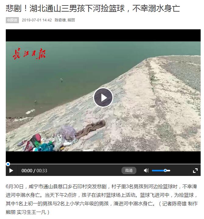 6月30日,咸寧市通山縣慈口鄉(xiāng)石印村突發(fā)悲劇,村子里3名男孩到河邊撿籃球時(shí),不幸滑進(jìn)河中溺水身亡。當(dāng)天下午2點(diǎn)許,孩子在該村籃球場(chǎng)上活動(dòng)?;@球飛進(jìn)河中,為撿籃球,其中1名上初一的男孩與2名上小學(xué)六年級(jí)的男孩,滑進(jìn)河中溺水身亡。(記者陳奇雄 制作 熊麗 實(shí)習(xí)生王一凡)