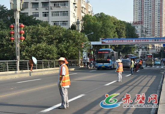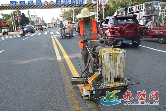 赤壁網(wǎng)消息(記者 聶愛陽)8月6日,記者在一橋路段看到,工人們正在對(duì)路面老舊交通標(biāo)線進(jìn)行重新噴涂工作。