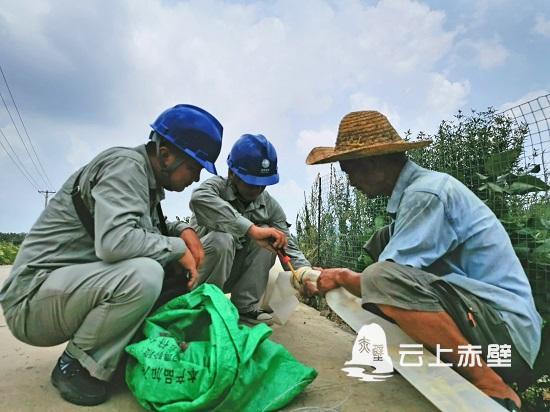 田紅云朋友圈中的這位微信好友是赤壁市供電公司的黨委書記余柒明。在得知斗門村農(nóng)田出現(xiàn)干旱的基本情況后,余柒明立即組織車埠供電所“星火”黨員志愿服務(wù)隊(duì)的志愿者們趕到現(xiàn)場(chǎng)勘查旱情,在向農(nóng)戶了解抽水灌溉的實(shí)際困難后,他們頂著高溫,將低壓線路引至遠(yuǎn)處的水源地,裝設(shè)電能表、漏電保護(hù)器、連接抽水泵,經(jīng)過一個(gè)多小時(shí)的作業(yè),讓水嘩啦啦流入了農(nóng)戶干涸的農(nóng)田。