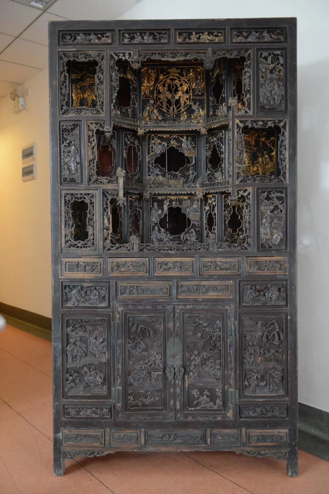這種盛行于明末清初的“看櫥”,既有實用性又有裝飾性,之所以稱之為“看櫥”,是因為在高192 cm,寬104cm,深45.7cm的有限體積內(nèi),以不同的樓臺亭閣布局,雕飾86組神話人物、戲劇故事和花鳥圖案,做到繁而不亂,一目一景,景景相聯(lián),出神入化,讓人目不暇接,原件現(xiàn)存湖北省群眾藝術(shù)館?!翱礄弧蹦依送ㄉ侥镜竦乃械窨碳挤ǎ碇ㄉ侥镜竦淖罡咚?。成希和謝志兵(通山縣非物質(zhì)文化遺產(chǎn)保護中心主任)想復(fù)制它。