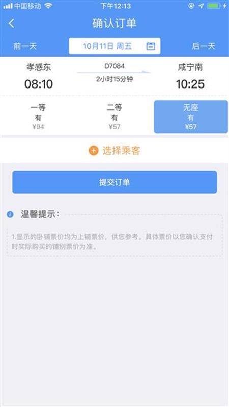 票價(jià)方面:一等座94元,二等座57元,無座57元。