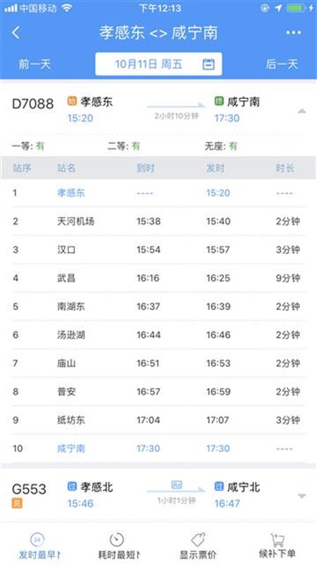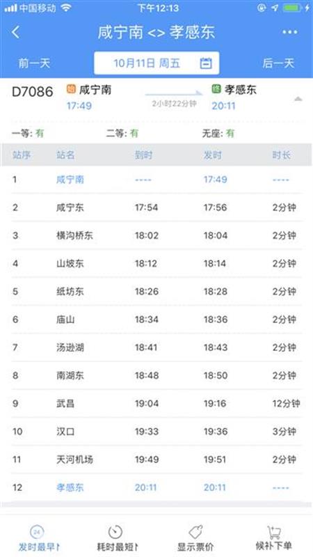 17時(shí)09分從咸寧南始發(fā),沿途??肯虒帠|、橫溝橋東、山坡東、紙坊東、廟山、湯遜湖、南湖東、武昌、漢口、天河機(jī)場(chǎng)等站,20時(shí)11分終到孝感東站。