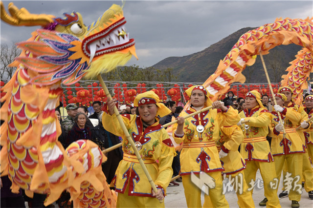 2019年2月2日,民間藝人在通城縣塘湖鎮(zhèn)荻田村紅色廣場(chǎng)舞龍。