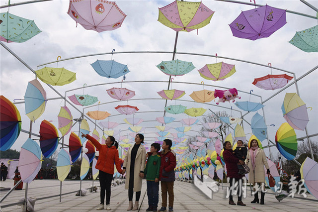 2019年2月2日,游客在通城縣塘湖鎮(zhèn)荻田村紅色廣場(chǎng)花傘“隧道游玩。