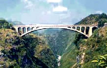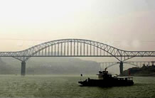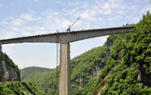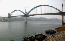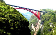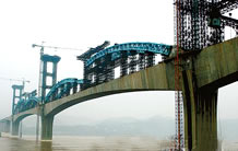 湖北宜萬鐵路野三河大橋位于湖北省恩施州建始縣與巴東縣交界處,它是一座主跨為124米不對稱雙線平行雙肋中式復(fù)合鋼管混凝土桁架坡拱橋,由中承式拱橋和下承式拱橋兩部分組成,這種不對稱坡拱橋在國內(nèi)尚屬首例。該橋由湖北省交通規(guī)劃設(shè)計(jì)院設(shè)計(jì),于2006年3月份開工,2007年1月成功合龍。