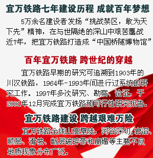宜萬鐵路開建可以追溯到1909年12月10日,其前身是川漢鐵路,最早由詹天佑主持修建,從宜昌往秭歸修了20多公里就被迫停工。直到2003年,鐵路才重新開工。從2003年12月開工至2010年8月18日宜萬鐵路全線鋪軌貫通,耗時(shí)七年,377公里的宜萬鐵路平均每年建成里程僅50多公里,成了國內(nèi)修建時(shí)間最長鐵路。