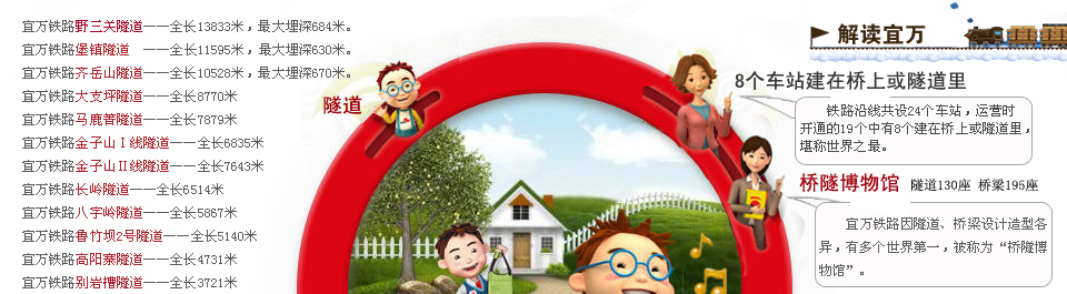 宜萬鐵路被稱為“橋隧博物館”。全線共有隧道159座(其中一級(jí)風(fēng)險(xiǎn)隧道8座,二級(jí)風(fēng)險(xiǎn)隧道26座),其中10公里以上隧道5座,總長338.7公里;全線有橋梁253座,總長69.64公里,其中特殊結(jié)構(gòu)橋梁29座,涵洞600多座;正線橋隧占線路總長的74%。據(jù)中鐵四局宜萬指揮部人士稱,宜萬鐵路的橋隧占比為世界之最。