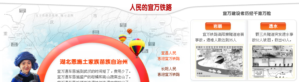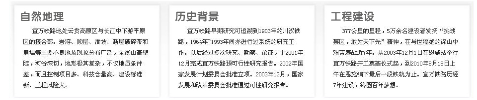 宜萬鐵路因穿越喀斯特地貌地區(qū),被譽(yù)為我國鐵路史上施工難度最大的山區(qū)鐵路工程。它集“西南山區(qū)鐵路艱險(xiǎn)之大成”,專家們稱之為“筑路禁區(qū)”。修建難,最難在隧道。宜萬鐵路的159座隧道中有70%位于石灰?guī)r地區(qū)。在中國鐵路建設(shè)史上,因?yàn)橐巳f鐵路,第一次為鐵路隧道按風(fēng)險(xiǎn)分為輕、中、高3個(gè)等級(jí)。
