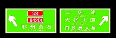 三環(huán)線由天興洲大橋往東新開發(fā)區(qū)光谷大道的一塊指路牌,左行指的是“關豹高速”,右行指的是“光谷大道”;但該路口左行是經(jīng)武黃高速去鄂州方向的,右行是經(jīng)三環(huán)線去白沙洲大橋方向的。路牌因信息不全、牌面又小,不少駕車人員到該路口時停車查看,不知行進方向。